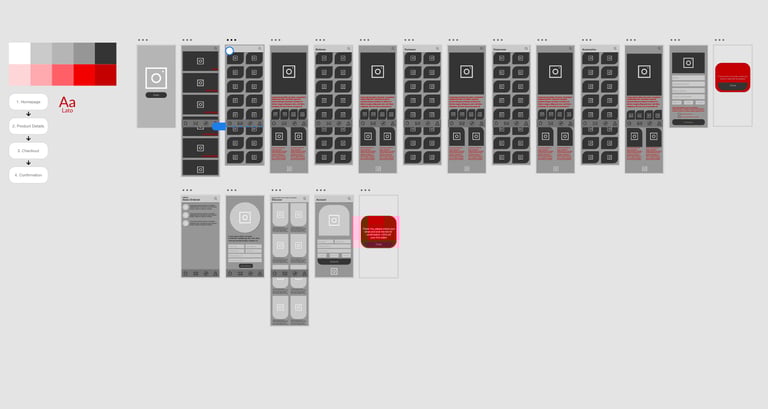 Strategic low-fidelity wireframes outlining key user flows, screen hierarchy, and interface structure to optimize mobile app usability.